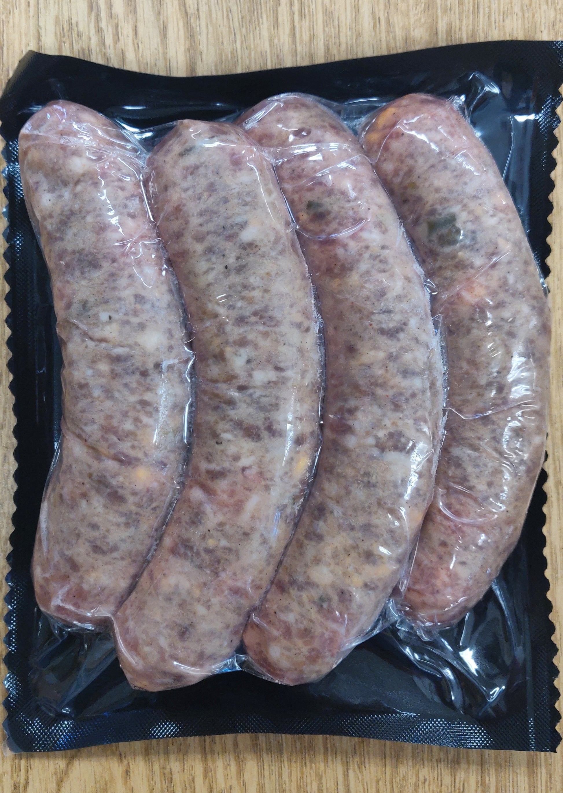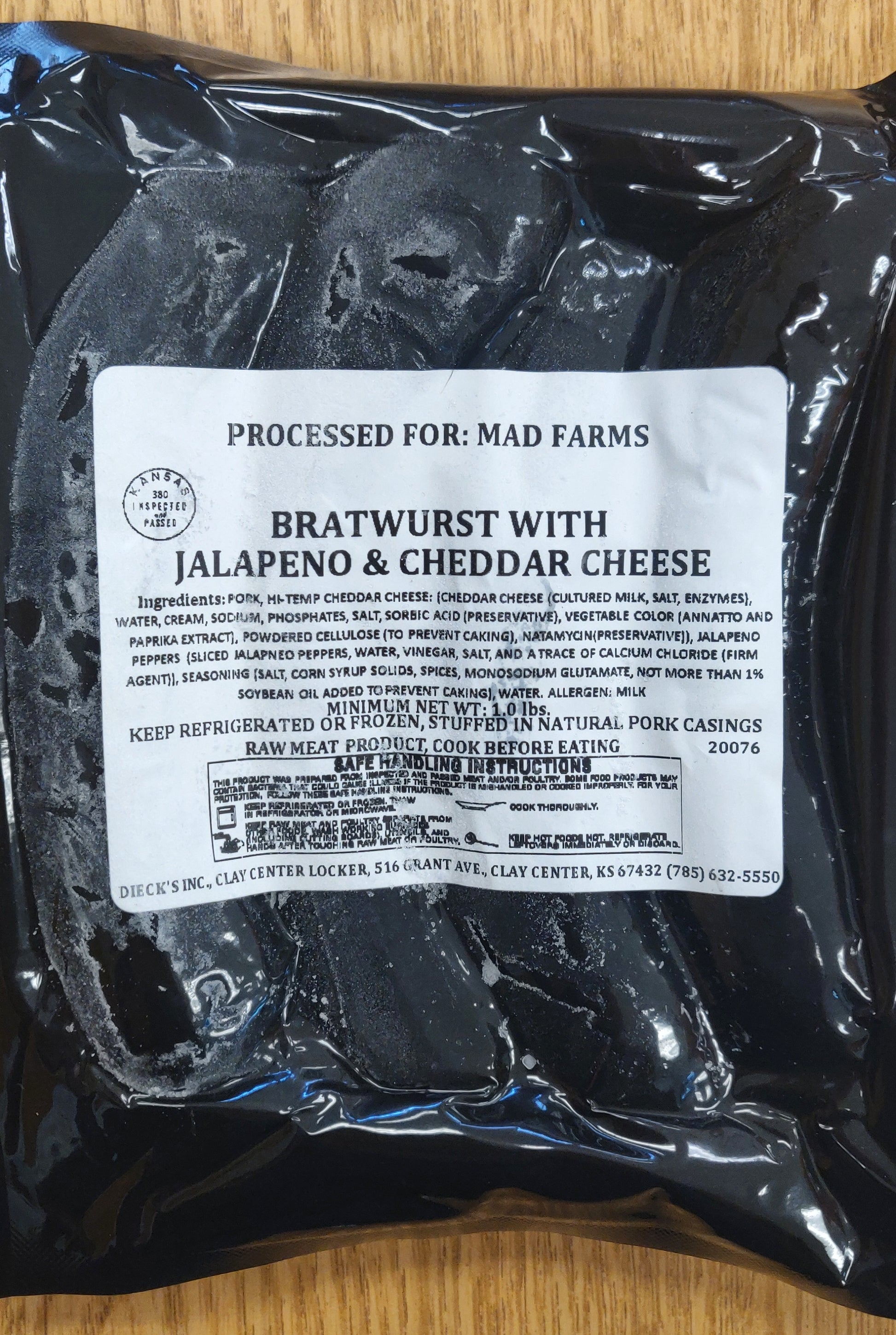 Add some spice to your barbecue with these jalapeño cheddar brats from M.A.D. Farms! Comes frozen in a package of 5 sausages (approximately 1 lb.).